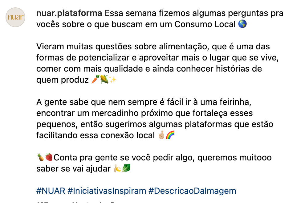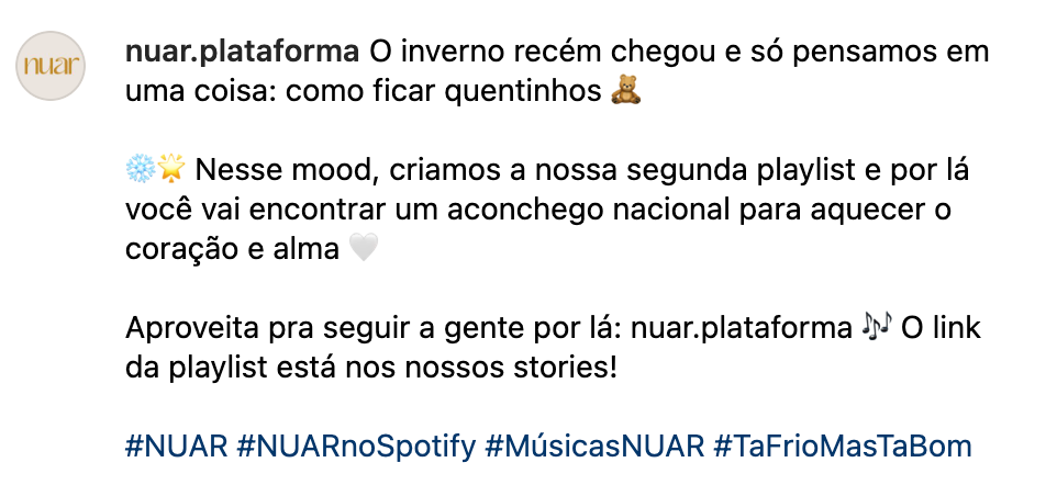 Em 2021, tive a oportunidade de atuar como redatora para a marca NUAR. Neste projeto, fui responsável por dar vida à marca nas redes sociais (Facebook, Instagram, LinkedIn, Twitter), através da criação de legendas e direção de conteúdo para as artes que foram publicadas nas redes sociais da marca.